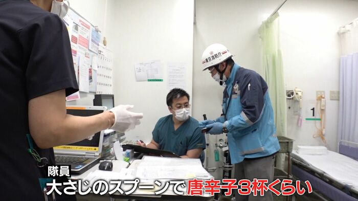 隊員「アジアン料理のお店で辛いスープとかを飲んだところ全部飲み干した後に、過換気症状、両手指先のしびれ感。辛さのレベルで10段階中9段階、大さじのスプーンで唐辛子3杯くらい入っているということです」