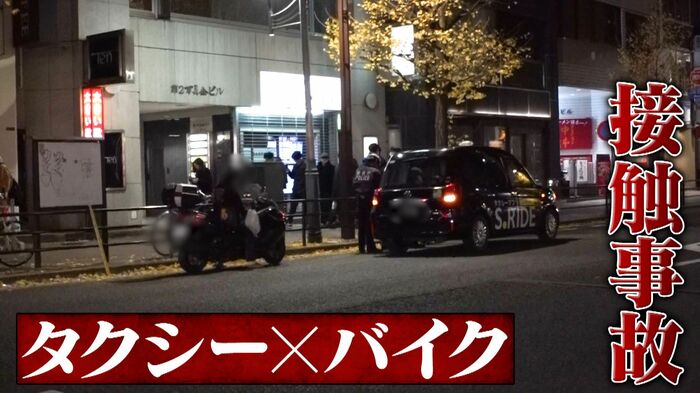 隊員「タクシーの後方をバイクが走行中、タクシーがお客さんを乗せるために急ブレーキをかけたためバイクの運転手も急ブレーキをかけたところ、ブレーキロックしてしまい右側に転倒」