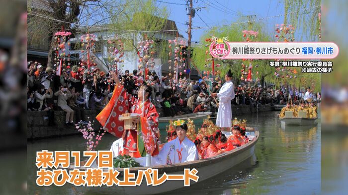 一番の見どころは、「さげもん」で飾られた柳川の掘割を華やかな衣装を着た子供たちが船で進む「おひな様水上パレード」。2024年は3月17日(日)11:00~12:20に開催予定です。(雨天時は20日に延期)