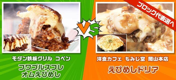 視聴者投票の結果は「フワプルスフレオムえびめし」43% 対「えびめしドリア」57%。岡山県の新ご当地グルメは、「洋食カフェ もみじ堂 岡山本店」さんの「えびめしドリア」に決定しました。