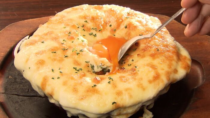 アツアツのえびめしドリアの真ん中にスプーンを刺すと、中からは半熟とろ〜っと卵が食欲をそそります。