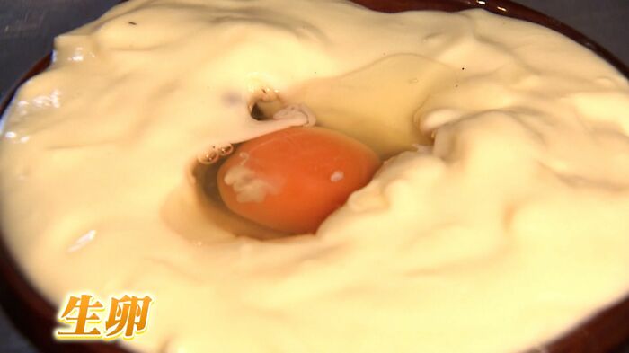 器に移したえびめしにベシャメルソースをかけて、真ん中には生卵。