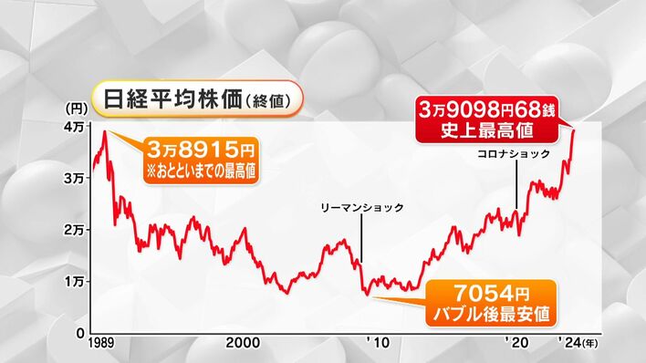 2月22日(水)の日経平均株価の終値は、3万9098円68銭となり、バブル絶頂期以来の最高値を更新しました。
