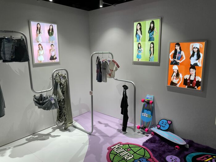 次は、セレクトショップ風のゾーンが登場。韓国の展示会で実際にメンバーが着用した衣装が飾られています。なんと、飾るために使われているハンガーは子供用なんだとか!本人たちの細さがより伝わります。