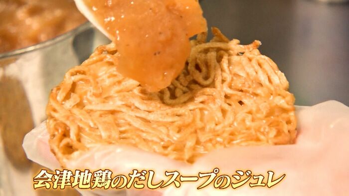 さらに会津地鶏のだしでとったスープをジュレ状のソースにし、麺のバンズに塗っています。