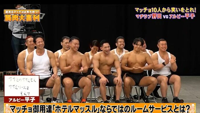 ということで、回答席も用意され、10人のマッチョ審査員も勢ぞろい。平子さんと野田さんは、進行の座をかけて「筋肉大喜利」で対決することになりました。