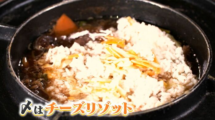 さらに、シメはすき焼きにご飯とチーズを入れてチーズリゾットに。牛肉のうまみが詰まった甘辛い煮汁をすったご飯と濃厚なチーズの間違いない組み合わせ。最後まで余すことなく楽しめます。