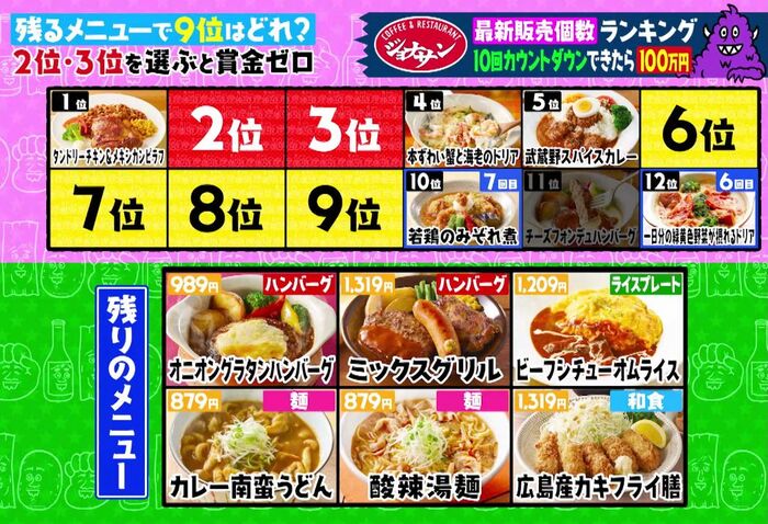残るメニューは、以下の6品(2位・3位・7位・8位・9位のいずれか)。