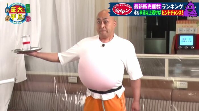 ここで長谷川さんが再び登場。満タンの水が入ったコップを持って巨大風船を爆破し、衝撃に耐える(半分以上水をこぼさない)というチャレンジにクリア(風船が勝手に割れてしまうというハプニングにより、ほとんど水がこぼれず!)し、ヒントチャンスを獲得しました。