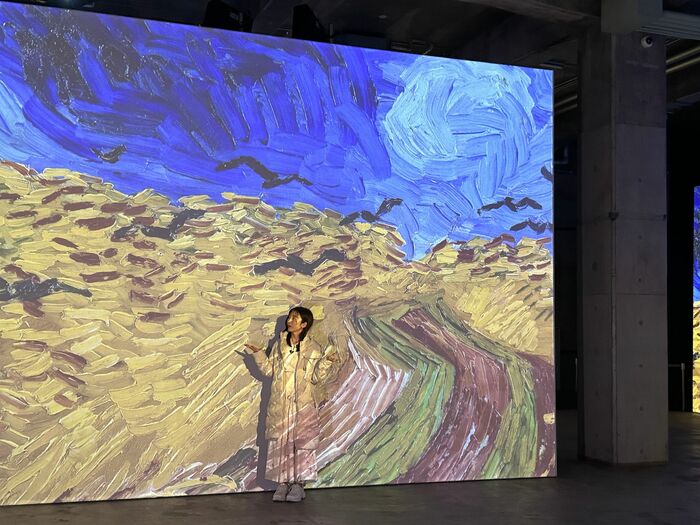 そして何よりすごいのが没入感。「うわ、大きい!」と佐久間アナが声をあげた「ヒマワリ」では作品の一部として溶け込んでいます。映像と音楽とアロマで、気持ちまですっかりゴッホの世界に引きこまれている様子でした。