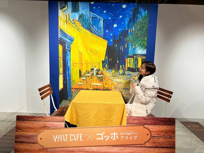 会場近くのアートギャラリーカフェ「WHAT CAFE」にもフォトスポットがあります。佐久間アナがまるで南仏の「夜のカフェ・テラス」でひと休みしているように見えます。