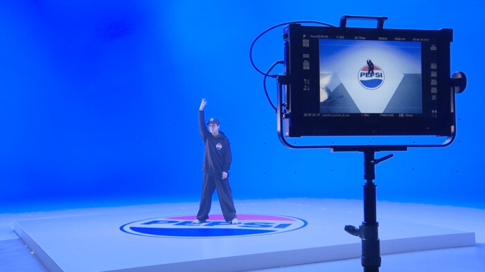 ペプシの新ロゴが床に刻まれた、シンプルな青い空間に、全身黒でキャップ姿の岩田さんが登場し、楽曲に合わせて岩田さんのルーツ(原点)でもある力強いクランプダンスをフリースタイルで披露しています。
