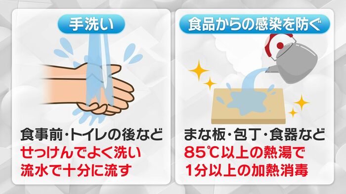 また「食品からの感染を防ぐ」には、まな板や包丁、食器、ふきんなどは使用後すぐに洗って、洗う際も85℃以上の熱湯で1分以上加熱消毒することが有効だということです。