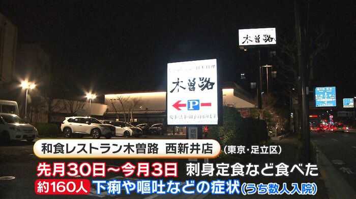 東京都内の和食レストラン「木曽路」では、1月30日~2月3日に刺身定食などを食べた約160人が下痢や嘔吐などの症状を訴え数人が入院したほか、