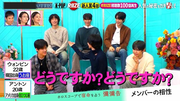 彌彌告さんいわく、メンバー同士で一番相性がいいのは、ショウタロウさんとウンソクさんだそう。お互いに足りないところを補い合う性格だそうで、ショウタロウさんは「ウンソクと出会って運気が上がったかな」と、笑顔を見せました。