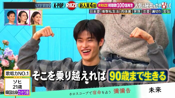 ソヒさんは44〜45歳で病気に要注意だそうですが、そこを乗り越えれば90歳まで生きるのだとか。一瞬、不安そうな表情を浮かべたソヒさんですが、最後はガッツポーズで笑顔を見せました。