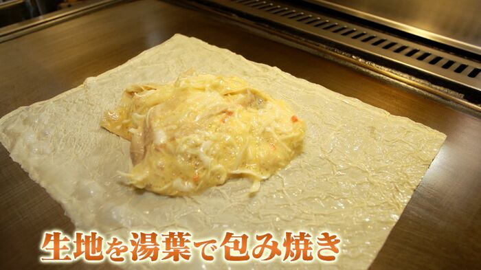 グルテンフリーの米粉やつくね芋、キャベツやエビにゆばも入った生地を鉄板の上に敷いた生ゆばで包み、焼き上げることで外はカリッと中はふんわりのお好み焼きに。