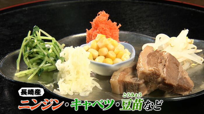 トッピングは、長崎産のニンジンやキャベツ、豆苗などを麺に絡みやすいように細かく切って提供。 さらに、半日かけて煮込んだ角煮がごちそう感を増しています。