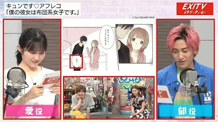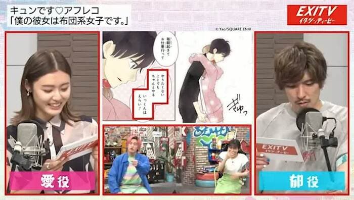 兼近は早速、布団系女子・愛に癒される彼氏・郁を体に入れ込み、いざキュンです♡アフレコ、ヒュイゴー!