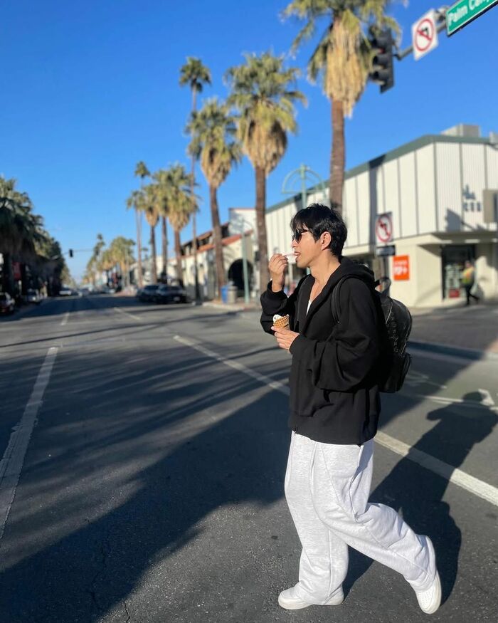 現地では、ワイドなグレーのスウェットパンツに、黒のパーカーを着たラフなスタイルを披露!大沢さんはコーンにのったアイスクリームをスプーンで食べながら歩く様子や…。