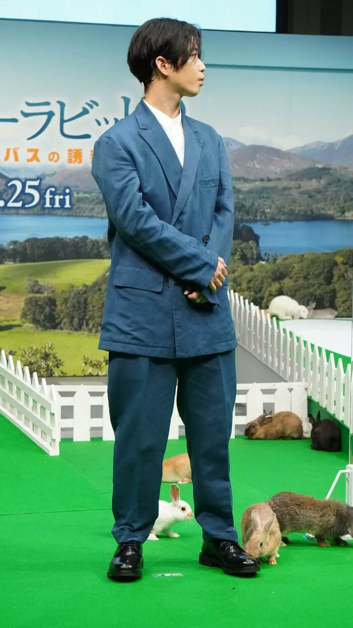 演じる上で気をつけたことについて「ピーターは表情が豊かで、それに合わせて声を吹き込むことが…」と真剣に語る千葉の足元には、引き寄せられるように再びウサギたちが集まる。千葉は、足元のウサギを気にしながらも、満面の笑みを見せた。