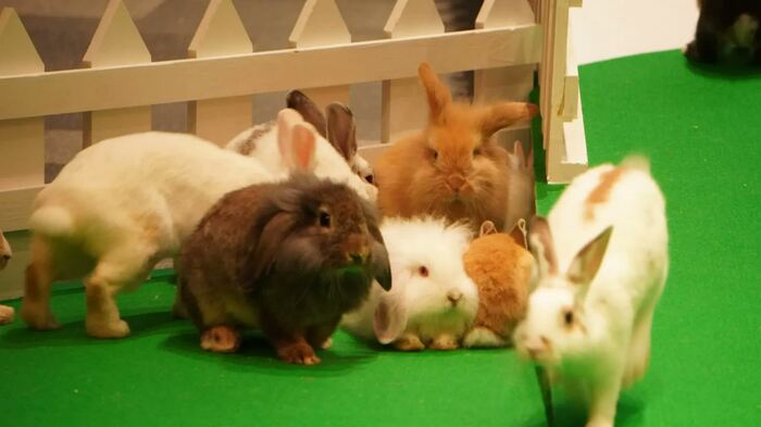 映画タイトルにかけて、「ぎっしりウサギ“特盛”まみれイベント」と題されたこのイベントにはウサギ60羽が登場。用意されたウサギ型のステージを自由に駆け回る和やかな雰囲気に。