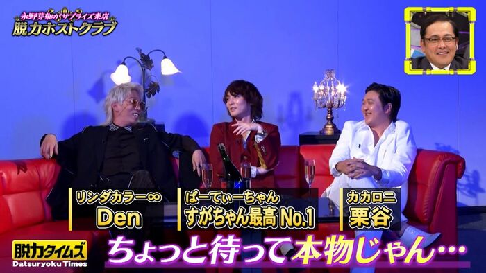Den(リンダカラー∞)さん、すがちゃん最高No.1(ぱーてぃーちゃん)さん、栗谷(カカロニ)さんによる、カリスマホスト3人衆が迎えました。