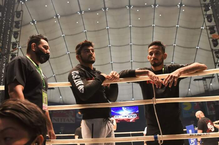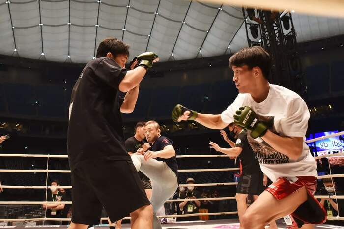朝倉未来選手と朝倉海選手は、ふたりでリングに登場すると、すぐに「リングが硬いかな」と感想を。いつも通り冷静な様子で打撃を確認し合うと、お互いグラウンドでどう動くかを丁寧にチェックしているように見えた。