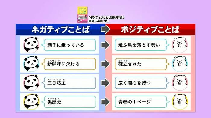 「ポジティブことば選び辞典」という本の、ネガティブをポジティブに変える言葉の選び方が紹介されると、峯岸は「“黒歴史”を“青春の1ページ”と、自分の心の中だけでも置き換えられたら(いい)」とコメント。