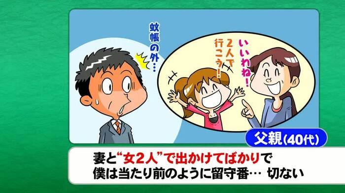 「表に出せない父親の本音」というテーマでは、「パパっ子だった娘が、小学校高学年になり妻と2人で出かけてばかりいる」という40代男性のエピソードが登場した。