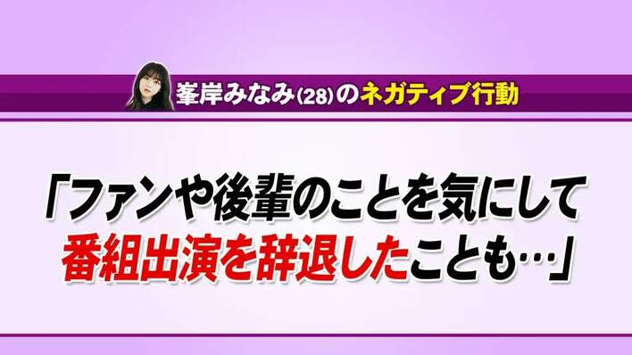「ネガティブをこじらせているのかな?」と峯岸は苦笑したが、番組公式SNSには「みーちゃん(峯岸)の気持ちわかる」「親近感が沸く」などのメッセージが寄せられた。
