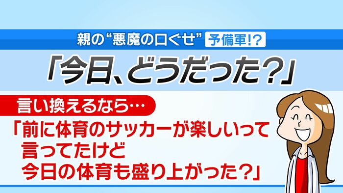 三木さんは「息子にとっては『今日はやらかさなかった?』という(意味合いの)イヤな質問になりそう」と想像し、馬場さんは「毎回同じ質問をすると、自分に興味がないと子どもが感じてしまう。本当は、『今日もおつかれさま』と言って隣にいるだけでいいし、前に話していたことを引用しながら話すなど、子どもに興味関心を持っていることを伝えるのが大切」と、親の基本的なスタンスについて語りました。