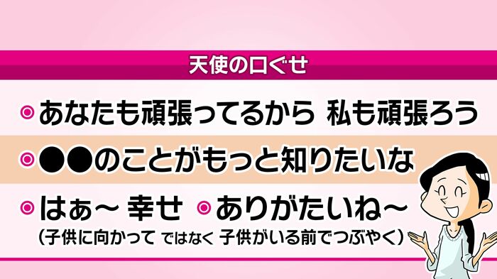 「あなたも頑張っているから私も頑張ろう」「幸せだな」など、親が子どもの前で意識して使いたい“天使の口ぐせ”については、坂下さんが「ご飯食べたりお酒飲んだりして、『あー幸せ!』って言っちゃうけど、それは違う?」と苦笑。