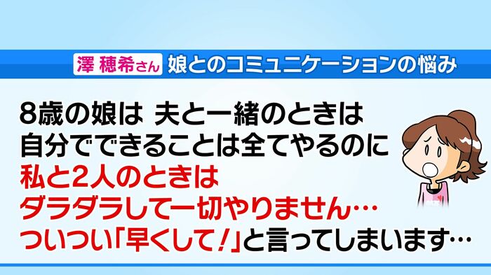 澤さんが「夫と一緒なら娘は自分のことは自分でやるのに、私と一緒のときはやらない。つい『早くして』と言ってしまう」と悩みを相談すると、馬場さんは「それは母に対する甘えですが、甘えられる存在は大切。やりきる力をつけるには、まずは安心できる存在が近くにいることが大切なので、存分に甘えさせて」と回答しました。