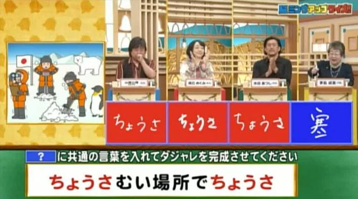 正解は「ちょうさ(超寒い場所で調査)」。山根、麻丘、水谷の3人が正解!