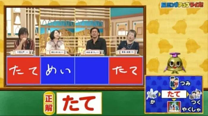 正解は「たて(片手・積み立て・たてつく・立役者)」。山根と茅島の2人が正解!