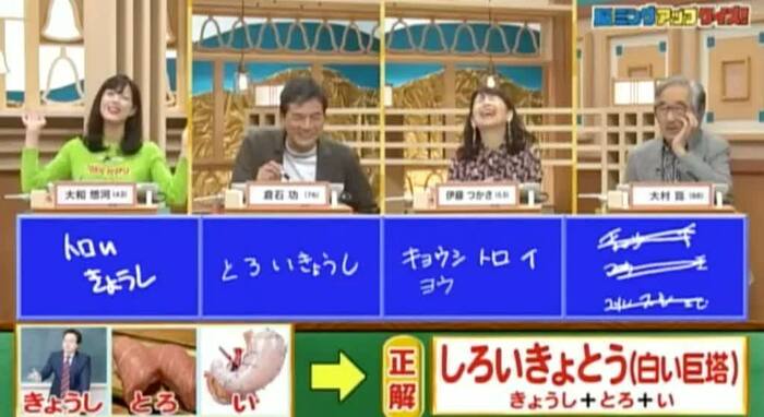 正解は「しろいきょとう(白い巨塔)」。残念ながら正解者はゼロ。
