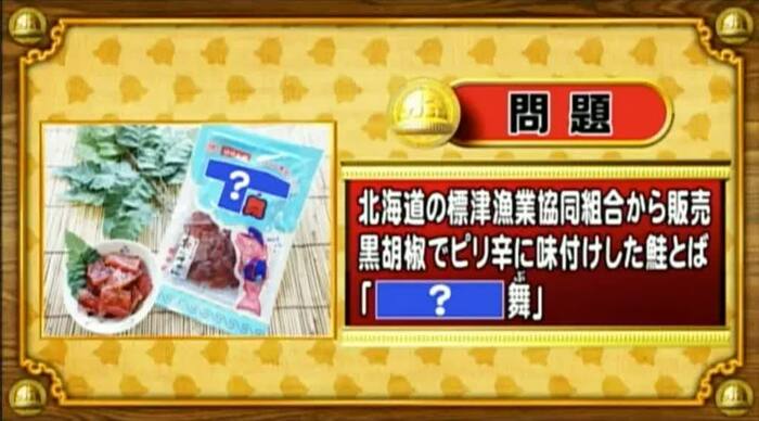 最後は、おもしろ商品名クイズ。北海道の標津(しべつ)漁業協同組合が販売している、黒胡椒でピリ辛に味付けした鮭とばの名前は「[?]舞(ぶ)」?