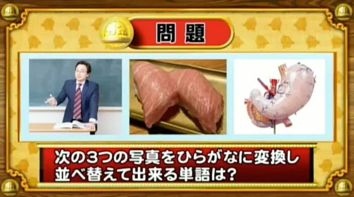 最初は「脳ミングアップクイズ」から、シャッフル写真の問題。次の3つの写真をひらがなに変換し、並べ替えてできる単語は何か?