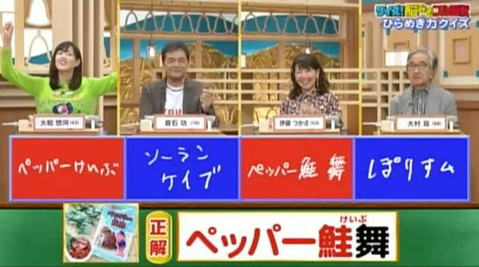 正解は「ペッパー鮭舞(けいぶ)」。ピンク・レディーのデビュー曲「ペッパー警部」(76年)が元ネタ。大和と伊藤の2人が正解!