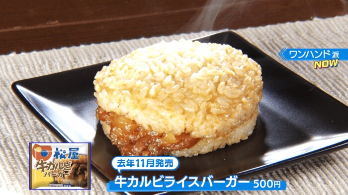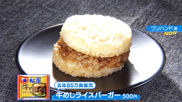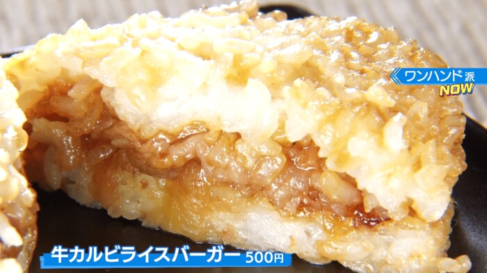 松屋の甘辛いタレがベースで、具材は牛肉とたまねぎ。牛めしをワンハンドに仕上げた「牛めしライスバーガー(500円)」。