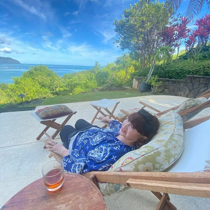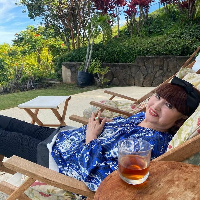 公開した写真には、青の華やかなトップスと黒のパンツ姿の黒柳さんが、自然に囲まれたリゾートのような空間で、デッキチェアに寝そべっている姿が!