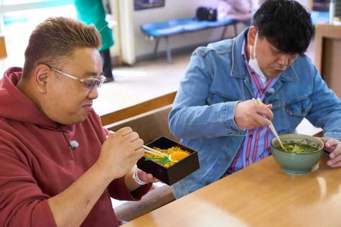 久慈駅に着いて早々、「北限の海女(あま)」で知られる特産のウニの煮汁で炊かれた黄金色のご飯と、蒸しウニで埋め尽くされた30年以上続く人気駅弁「ウニ弁当」がお出迎え。いきなりの豪華な朝食だけではなく、気になる情報を得てサンドウィッチマンの旅が始まる。