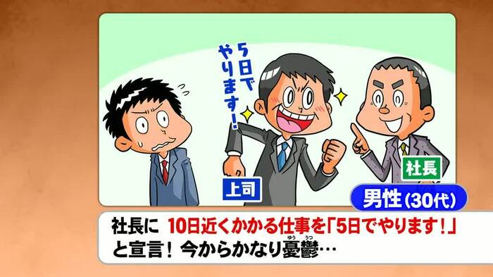 前向きなのはいいけれど、正論すぎたり押しつけがましくてちょっと面倒な「ポジティブやっかいさん」についての話題では、「上司が社長に向かって、10日はかかる仕事を『5日でやります!』と言っていて、憂鬱になった」という30代男性のエピソードが登場した。