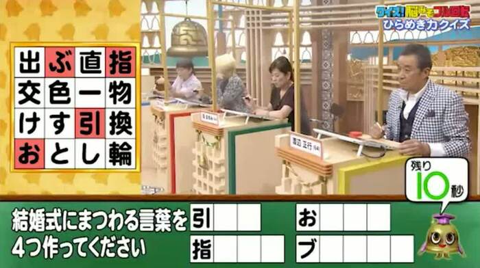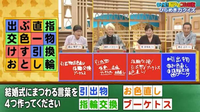 正解は「引出物」「お色直し」「指輪交換」「ブーケトス」。畠山、藤原、岡の3人が正解。