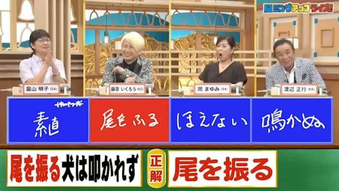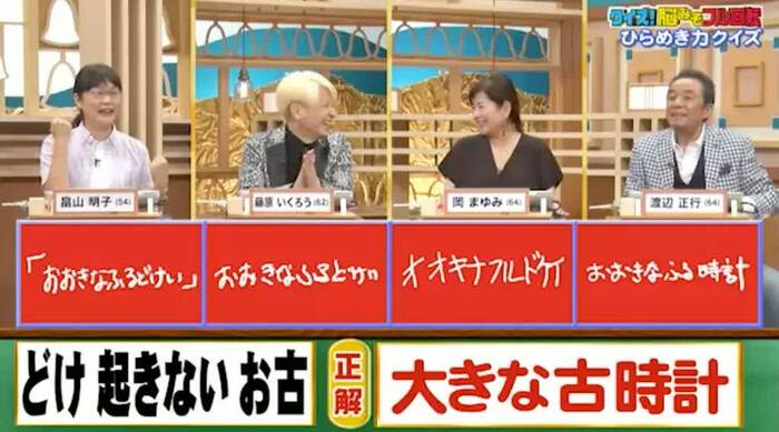今回の解答者は、女優の畠山明子(54)、作編曲家でピアニストの藤原いくろう(62)、女優の岡まゆみ(64)、お笑いタレントの渡辺正行(64)の4名。