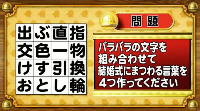 次は、結婚式パズル。バラバラの文字を組み合わせて結婚式にまつわる言葉を4つ作成せよ。