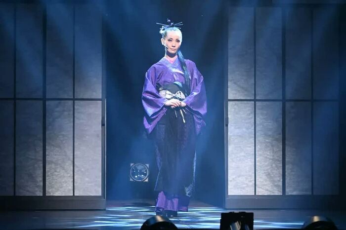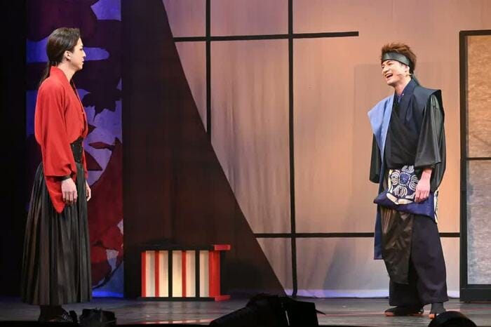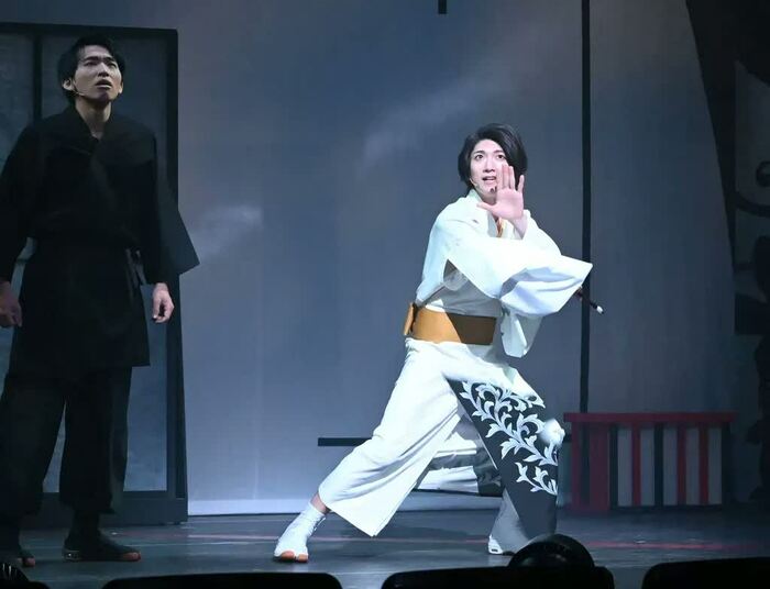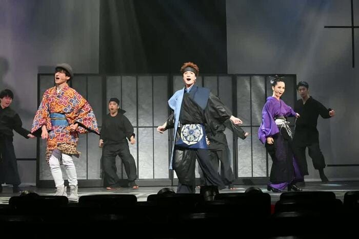 この日公開されたのは、松崎が演じる蔦屋重三郎をはじめとする5人の“操り人”が悪党の心を操り、(敵同士で斬りあいをさせるなどして)成敗するシーン。入れ替わり立ち替わりステージ前面に出てきては、音楽に合わせ華麗なポージングを決め、次々と悪党を倒していく。
