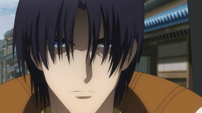 翁(柏崎念至/cv.千葉繁)を斬り、巻町操(cv.⼭根綺)を背に去り葵屋に現れた四乃森蒼紫(cv.内⽥雄⾺)は、葵屋の御庭番衆に緋村剣⼼(cv.⻫藤壮⾺)の居場所を問う。