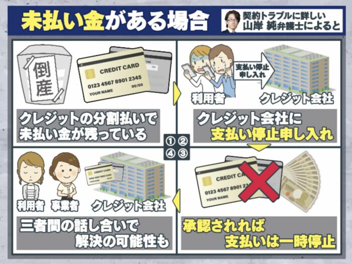 クレジット会社に支払い停止の申し入れが可能。承認されれば支払いは一時停止され利用者・事業者・クレジット会社、三者間の話し合いで解決の可能性があるということです。